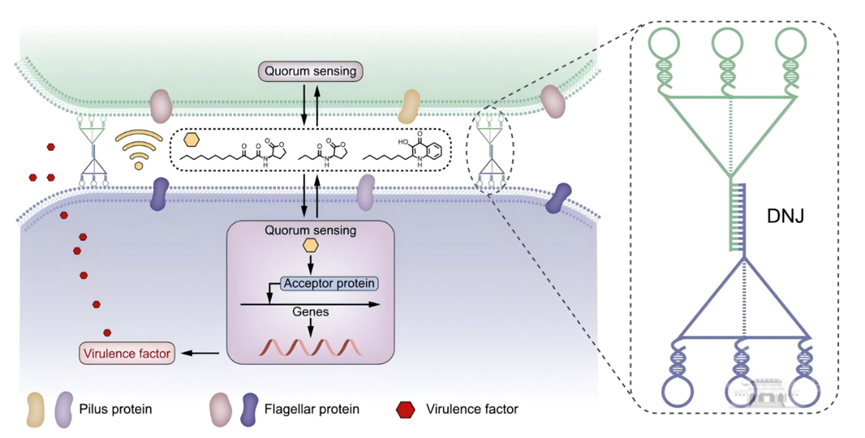 作为编码所有生命形式信息的化学分子,核酸具有易于合成、结构可预测、灵活可编程等优点,可以在纳米尺度上编程执行特定的功能,引起了研究者的广泛关注。鉴于此,中国科学院福建物质结构研究所张云团队与武汉大学袁荃教授团队、余锂镭教授团队以及中国科学院杭州医学研究所蔚泓院士团队合作,基于核酸分子独特的性质与功能,通过自组装策略,发展了一种功能核酸纳米框架平台,通过灵活的调控靶向核酸分子序列以及核酸四面体框架大小,可实现微生物相互作用的特异性精准编码。该研究以铜绿假单胞杆菌种内相互作用为研究模型,结合转录组学等分析手段,发现铜绿假单胞杆菌种内空间组装可作为群体感应表面传感的菌毛、鞭毛蛋白的表达,提高铜绿假单胞杆菌响应群体感应信号分子高丝氨酸内酯响应的能力,进而促进了铜绿假单胞杆菌群体感应信号通路的进行,诱导毒力因子包括绿脓素、碱性蛋白酶、鼠李糖的产生。这种基于微生物间相互作用产生的毒力因子代谢异质性使得其对人体肺泡细胞促炎免疫因子的产生同样具有不一样的影响。此外,利用所构建的功能核酸框架平台,成功编码了更为复杂的铜绿假单胞杆菌-大肠杆菌种间相互作用模型。此研究所提出的功能核酸框架平台策略有望为编码复杂的相互作用提供新的思路,为揭示不同类型的微生物相互作用及代谢空间异质性机制研究提供技术支撑,有望用于功能性多细胞体系设计以及疾病治疗等应用领域。