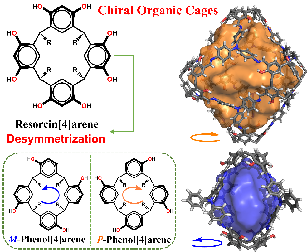 手性多孔有机笼(CPOCs)作为生物仿生封装体系的重要人工模拟物,在不对称催化、手性分离及传感等领域具有重要应用价值。然而,传统手性笼的构建多依赖于有限的手性模块(如环己二胺、联萘二胺等),且手性杯芳烃衍生物作为前驱体构建CPOCs的研究长期处于空白。如何开发新型手性模块并实现高效、可扩展的CPOCs创制,是该领域的重要挑战。