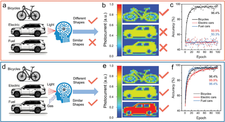 在机器人视觉、自动化制造和自动驾驶等领域,精确识别物体至关重要。当前的传感器技术通常依赖单一类型的刺激,经常在准确性上不足。刘伟研究员团队与徐刚研究员团队合作研究一种基于范德华异质结的自供能仿生双模传感器,用于精确识别物体。通过精确堆叠方法制备了一种新型的Sb2Te3/WSe2型I异质结,通过在价带创建单侧障碍和在导带实现近零偏移,克服了光和气体传感材料在结构要求上的矛盾。通过卷积神经网络(CNN)训练,模拟视觉和嗅觉传感数据,实现了对自行车、电动汽车和燃油汽车的高准确率识别。本工作实现了在单设备中集成光电子和气体传感性能的最佳表现,实现了首个仿生视觉-嗅觉双模识别,为创建高效的自供能传感材料提供了新方法,为下一代仿生双模设备在环境保护、医疗保健等领域的广泛应用铺平了道路。