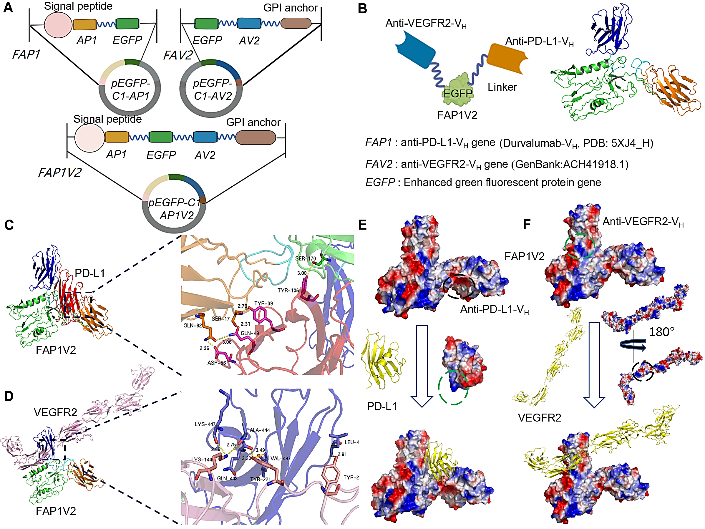 图1.复合物FAP1V2/PD-L1及FAP1V2/VEGFR2的胞内抗体设计及分子对接。(A)重组双特异性胞内抗体基因(FAP1V2)序列包含IL-2信号肽、抗PD-L1 VH基因(AP1)和抗VEGFR2 VH基因(AV2)、EGFP报告基因以及GPI锚定序列。pEGFP-C1-AP1携带FAP1,pEGFP-C1-AV2携带FAV2。(B)FAP1V2的三维模型。橙色区域表示抗PD-L1 VH(AP1);深蓝色区域表示抗VEGFR2 VH(AV2);绿色区域表示EGFP,其通过(GGGGS)₃连接子(以浅蓝色显示)分别与抗PD-L1 VH和抗VEGFR2 VH融合。(C)和(D)分别为FAP1V2与PD-L1(红色)和VEGFR2-ECD(粉色)的分子对接及结合位点预测。(E)FAP1V2与PD-L1间接触电位。(F)FAP1V2与VEGFR2间接触电位。正电荷区域用黑色圆圈标出,负电荷区域用绿色圆圈标出。静电表面图中,蓝色和红色分别代表中性pH条件下所呈现的正静电电位和负静电电位。