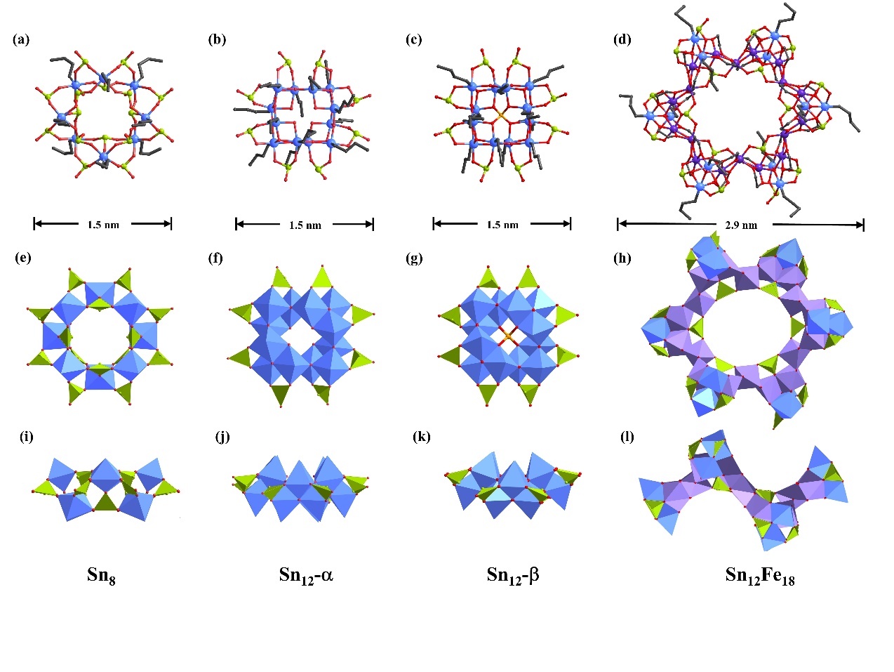 图1. 亚硒酸有机锡氧合分子环结构:(a-d) Sn8、Sn12-α、Sn12-β和Sn12Fe18的分子结构;(e – l) 对应的多面体俯视图和侧视图。