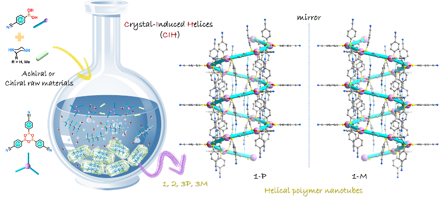 近日,中国科学院福建物质结构研究所张健研究员团队创新性地提出了一种分级自组装策略,通过动态共价键与非共价相互作用的协同效应,首次实现了纯手性螺旋聚合物纳米管的单晶合成。该研究采用市售原料通过一锅法反应成功构建了手性螺旋聚合物纳米管,其形成机制基于硼氧烷结构单元的原位生成,进而自组装形成螺旋骨架与纳米管结构。在组装过程中,动态共价键(B-N、B-O)驱动聚合物主链形成,而纵向氢键(C≡N···H-N)相互作用促使螺旋结构卷曲为封闭纳米管,相邻芳环间丰富的π-π相互作用则进一步稳定了该结构。研究团队基于单晶-单晶(SCSC)转化过程(从线性链到螺旋纳米管)及合成过程中圆二色(CD)光谱的实时监测,提出了结晶诱导螺旋(CIH)纳米管的分级自组装形成机制。值得注意的是,由于纳米管内富含N/O官能团以及大量共价/非共价相互作用,该螺旋聚合物纳米管表现出优异的亲水性和水稳定性,研究人员还系统研究了其质子传导性能。该合成方法展现出良好的普适性,可适用于多种前驱体。研究发现,由非手性前驱体制备的螺旋聚合物纳米管单晶均呈现单一手性特征,通过手性诱导可获得对映体过剩的纳米管;而使用手性前驱体则可直接得到单一手性螺旋聚合物纳米管。值得关注的是,这些纳米管材料均表现出显著的光致发光特性。