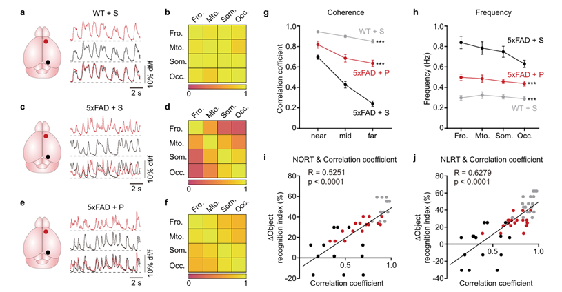 在前期研究的基础上,张云团队进一步探索了基于皮层网络慢波活动的阿尔茨海默病药物筛选。研究发现,Pitolisant(一种已获临床批准的组胺 H3 受体(H3R)拮抗剂 / 反向激动剂,主要用于治疗嗜睡症)在改善 AD 小鼠模型认知功能和脑网络障碍方面具有较大的潜力。经过 15 天的 Pitolisant 治疗后,AD 模型小鼠的识别记忆、学习灵活性和空间记忆能力均得到明显提升。在行为学测试中,小鼠对新物体和位置的探索时间显著增加,表明其认知功能有所恢复。通过宽场钙成像技术,研究人员观察到 Pitolisant 能够恢复大脑皮层慢波的同步性。这种慢波活动与记忆巩固和脑网络功能密切相关。慢波同步性的改善与认知能力的提升呈显著正相关。不仅如此,Pitolisant 治疗显著减少了小鼠脑内的 β- 淀粉样蛋白(Aβ)沉积和营养不良性神经突起的数量,同时增强了神经元溶酶体的活性。