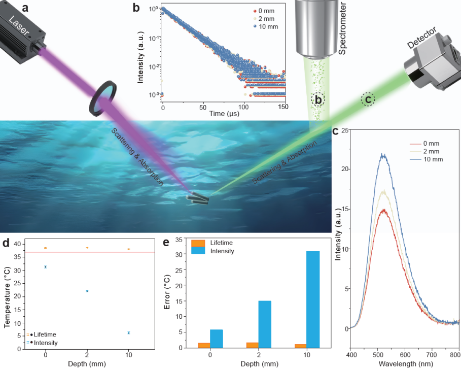 图3 (a)不同深度水环境中的温度传感示意图;(b-c) TPP3Cu2Br2在不同深度水环境中荧光寿命和荧光强度变化;(d-e)基于荧光寿命和荧光强度的温度传感误差值。
