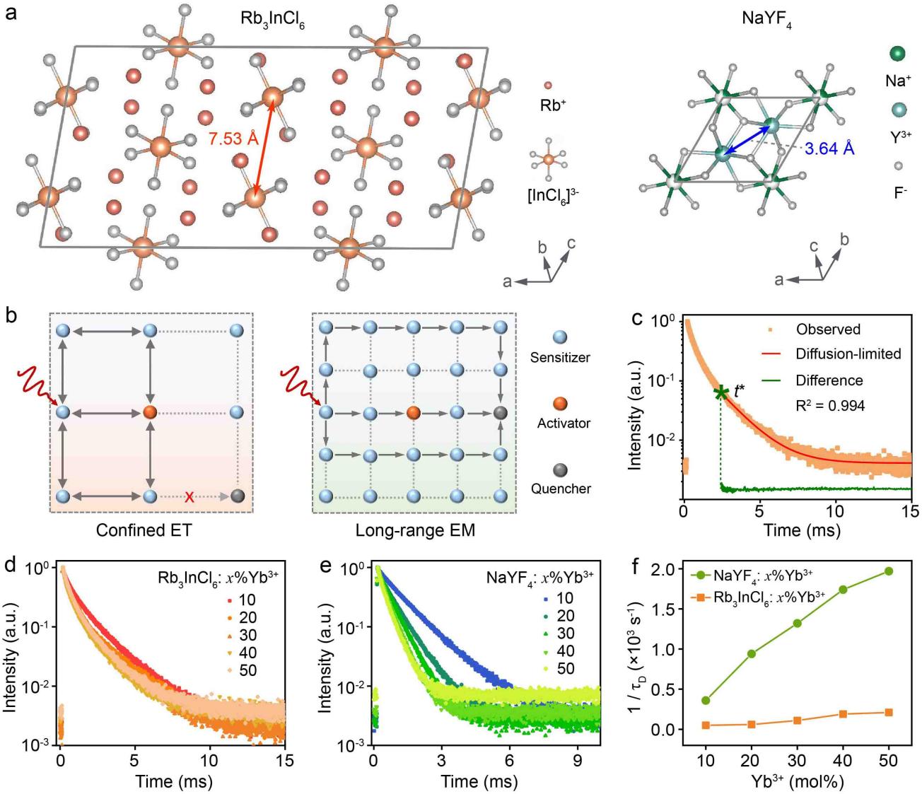 图2 Rb3InCl6: Yb3+/Er3+中Yb3+/Er3+限域能量传递:(a)Rb3InCl6和NaYF4的晶体结构;(b)限域能量传递与长程能量迁移示意图;(c)受限能量迁移模型拟合荧光衰减曲线;(d)Rb3InCl6: x%Yb3+与(e)NaYF4: x%Yb3+中Yb3+的荧光衰减曲线及(f)能量迁移速率。