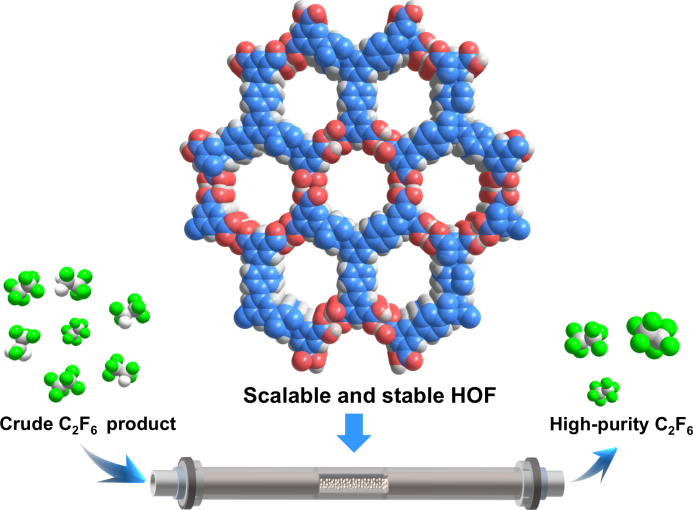 近日,中国科学院福建物质结构研究所吴明燕团队在《Angewandte Chemie International Edition》期刊发表了题为“Scalable Synthesis of Stable Hydrogen-Bonded Organic Framework for Efficient Hexafluoroethane Purification”的研究论文。该工作在团队前期工作的基础上设计并合成了一例具有适宜孔径大小和独特表面电势分布的氢键有机框架材料HOF-TDBB。 此材料在静态与动态的吸附实验中均优先吸附氢氟乙烷气体(CF3CH2F和CF3CHF2),并且可以实现从CF3CH2F/CF3CHF2/C2F6的气体混合物中一步纯化得到C2F6。这是HOF材料首次实现C2F6高效纯化。在一次突破实验中,HOF-TDBB可纯化11.7 mol kg-1的高纯C2F6,这一产量高于已报到HOF材料。此外,此材料具有非常优异的稳定性,可在不同的分离流速,环境温度中实现良好的C2F6纯化。更重要的是,此HOF可通过简单的旋蒸方法快速且规模化制备,并且规模化制备的样品对C2F6纯化的效果与单晶样品相当。
