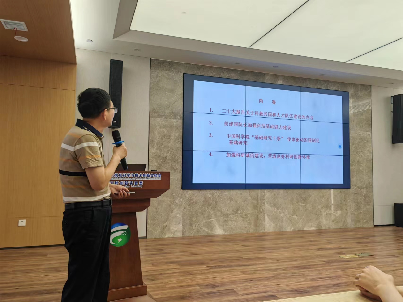 会上,毛江高以《党的二十大关于科教兴国、加强基础研究、加强学风建设和弘扬科学家精神的学习体会》为题,分享自己对党的二十大报告关于“实施科教兴国战略,强化现代化建设人才支撑”学习体会,他还深入解读了中国科学院院长侯建国在人民日报发表的《加强科技基础能力建设》的重点举措及中国科学院“基础研究十条”的系列新政策,最后,从科研不端行为的典型案例引入,阐述了加强科研诚信建设的重要性以及如何营造良好科研环境的思考与感悟。