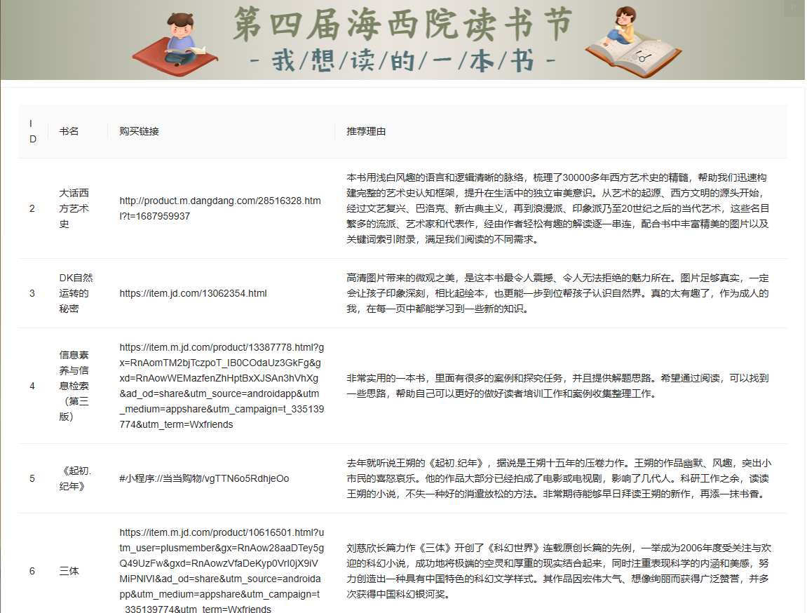 为贯彻二十大报告中提出的“深化全民阅读活动”,响应党中央“倡导全民阅读,建设书香社会”的号召,鼓励海西院学生、职工和博后阅读优秀书籍,丰富业余生活,陶冶情操,在海西院营造一个良好的相互交流和沟通的学习氛围,进而推进海西院全体人员的文化自信自强,海西研究院团委联合海西研究院工会、技术支撑中心党支部共同举办海西研究院第四届读书节系列活动。本届读书节活动于9月4日圆满结束,包含了“我想读的一本书”荐书、“我为大家荐好书”短视频荐书评比、“共建书香家庭 同享绿色阅读”21天阅读打卡赠书等三个活动。