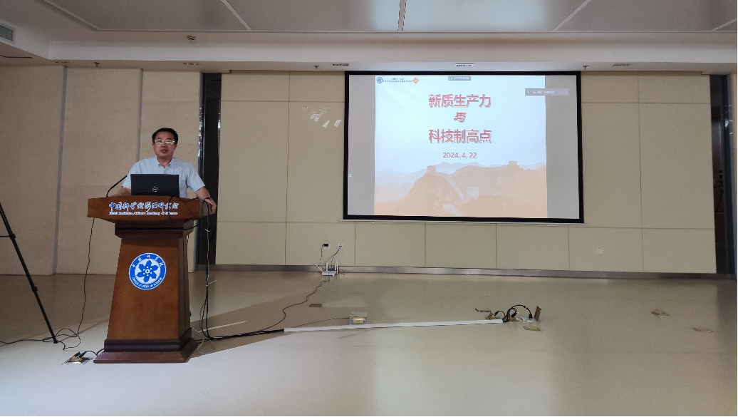 4月22日下午,福建物构所党委书记黄艺东以“新质生产力与科技制高点”为题讲授专题党课。会议由材料中心党总支书记张戈主持,材料中心四个支部的60余名党员参加。