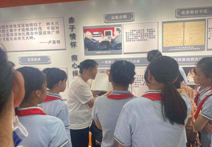 卢嘉锡科学教育基金会秘书长卢葛覃老师和科普志愿者们带领学生们参观了基地展厅。卢老师讲解了“科学家分子式C3H3”的由来,并以卢嘉锡先生的实验记录本为实例,进一步阐述卢老先生“C3H3”精神,即清醒的头脑、灵巧的双手和洁净的习惯,最后她勉励同学们以老一辈科学家们为榜样,在学习和生活中保持良好的习惯。科普志愿者们为学生们介绍了福建物构所的发展历史以及所取得的科研成果。
