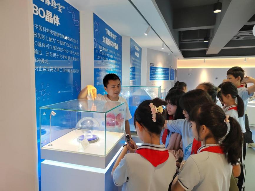 王国富研究员和李丙轩高级工程师带领同学们参观了基地二楼的人工晶体博物馆。在馆内,大家了解了晶体的概念、类别、生长方法、设备及应用。在“中国牌”晶体展柜前,同学们聚精会神地听老师的讲解,为中国能做出这样的晶体感到自豪,同时纷纷感叹晶体在科技和生活中的神奇应用。