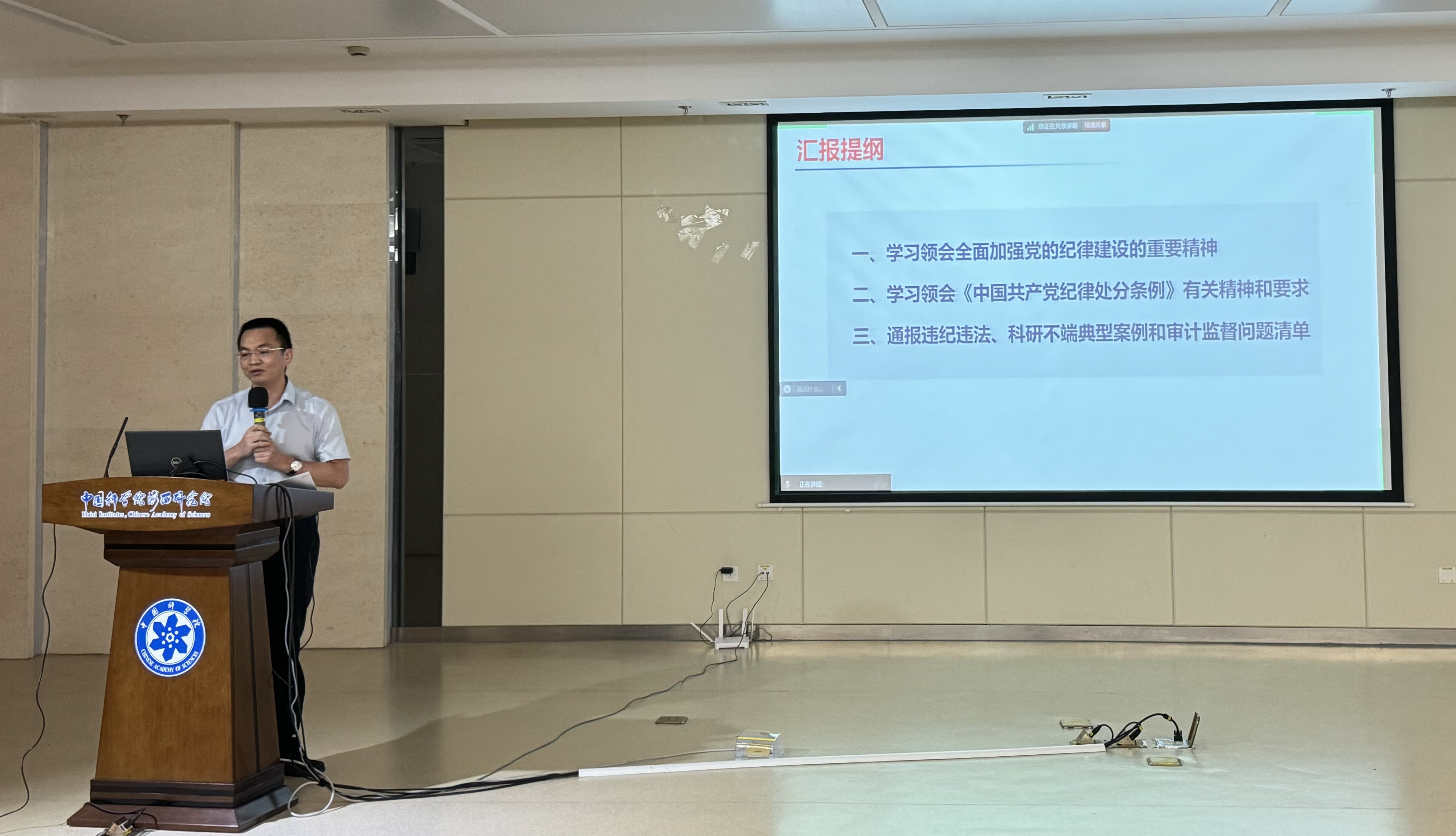 党委副书记、纪委书记方荣良作了《以纪促行 以案为鉴 为抢占科技制高点提供坚强纪律保证》的专题报告。引导大家深刻认识全面加强纪律建设的重大意义,全面理解和把握《中国共产党纪律处分条例》修订的重要意义和主要内容,准确把握党纪学习教育的目标要求,扎实推动党纪学习教育入脑入心。通报了中国科学院近年来违纪违法典型案例、审计监督发现的问题清单和国家自然科学基金委近年查处的科研不端行为典型案例。要求广大干部职工强化纪律规矩意识,恪守科研行为规范,引以为戒、警钟长鸣,深化以案为鉴、以案促改、以案促治,为抢占科技制高点营造良好的科研创新生态。