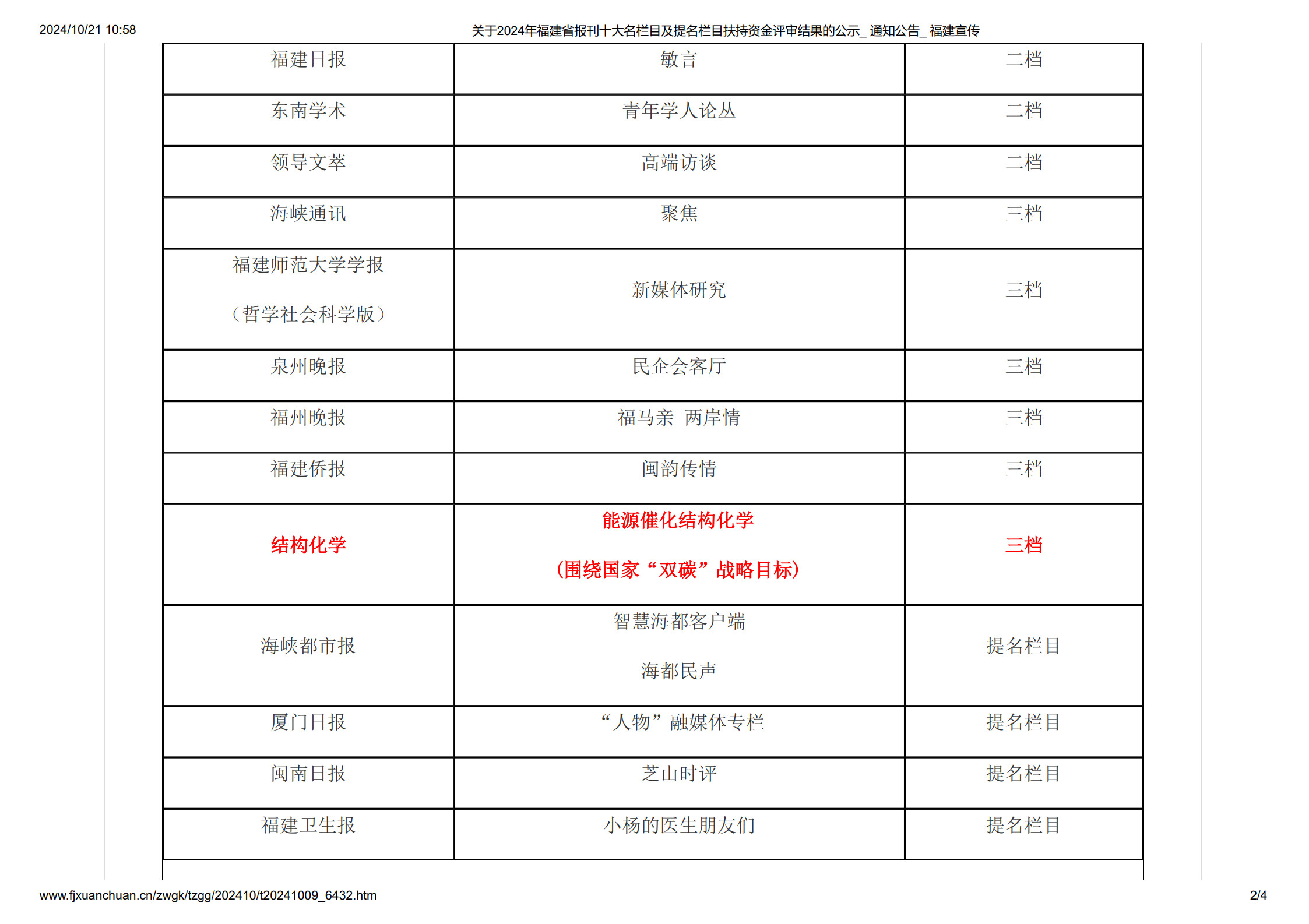 《结构化学》“能源催化结构化学(围绕国家‘双碳’战略目标)栏目”荣获2024年福建省报刊十大名栏目。该栏目在国家“双碳”战略的指导下,致力于高效能源催化体系的探索,为实现“双碳”目标研究提供了重要的学术交流平台及有力支持,也为相关创新发展提供了理论基础。