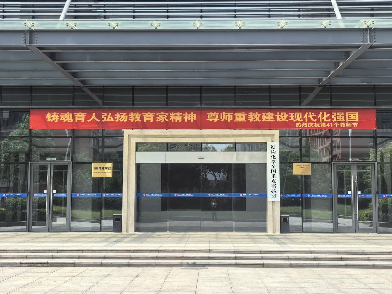 清晨的海西院园区洋溢着庄重而温馨的氛围。悬挂于嘉锡楼的红色横幅“铸魂育人弘扬教育家精神,尊师重教建设现代化强国”格外醒目,彰显出物构所坚持科教融合、尊师重教的坚定理念。宣传主题海报上,秉初心立德树人,育天下英才;续杏坛弘道铸魂,担强国大计联语铿锵有力,传递出研究所立德树人、服务国家的使命担当。