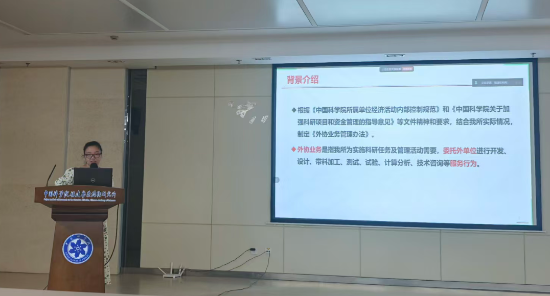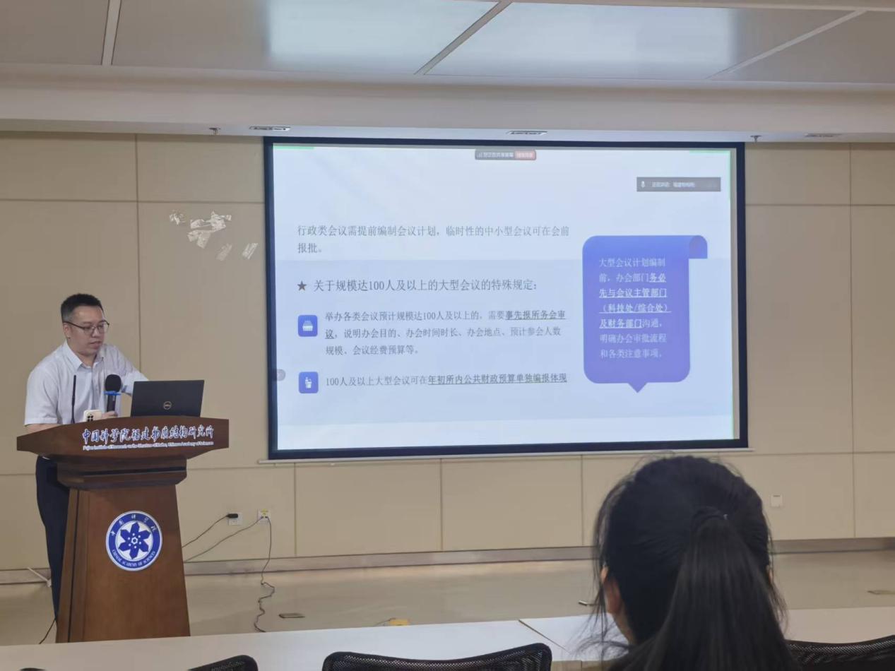会上,林恒丰处长首先介绍了研究所近年来财务管理相关内控制度的修订情况,并对差旅费、会议费、劳务费以及公务接待管理办法等进行了详细的政策解读。资产财务处资产主管林玲和科学技术处工作人员张芬分别介绍了新修订的器材采购、固定资产、材料与低值品、外协业务等相关制度的变化内容以及业务管理流程。最后,资产财务处经费管理专员徐慧婷分享了科研项目经费监审常见问题及应对经验总结,并对跨组群项目经费管理提出了具体规范要求。