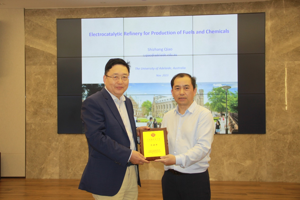 应福建物构所所长曹荣邀请,澳大利亚阿德莱德大学乔世璋院士于2023年11月23日访问福建物构所,并作了题为“电催化炼制产生燃料和化学品”的学术报告。张健副所长主持报告会,并为乔世璋院士颁发了海西研究院“卢嘉锡讲座专家”荣誉纪念牌。在报告会上,乔院士介绍了他们研究团队通过理论计算、原位表征和实验验证相结合的方法对析氢、析氧、二氧化碳还原等反应过程和催化机理的研究成果,特别介绍他们对相关联单原子催化、催化剂表面局域环境对催化表现的影响等概念的提出、理解和发展过程,以及对电催化海水直接分解制氢研究的理解和贡献。报告深入浅出、生动有趣,引起了师生们极大兴趣,会场座无虚席。报告后,乔院士还与物构所师生进行了深入的讨论,并就大家的提问做了详尽的解答。