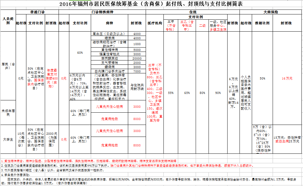 2016年福州市居民医保统筹基金(含商保)起付线、封顶线与支付比例简表