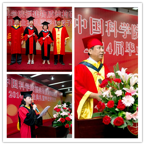 6月18日下午,福建物构所举行了2014年度研究生毕业典礼暨学位授予仪式。物构所学术委员会主任洪茂椿院士,副所长兰国政、黄艺东、林文雄、卢灿忠出席了典礼。2014届毕业生、导师代表、各部门负责人、部分在读研究生及毕业生亲友等近200多人参加了活动。毕业典礼由研究生部主任林璋主持。