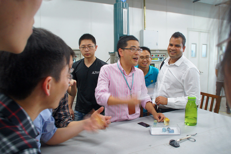 福晶公司经理陈伟、李雄引导同学们参观了熔盐法、提拉法的晶体生长技术车间和先进的镀膜生产技术设备,介绍了数控加工、双抛、环抛等多种加工手段以及IAD,IBS,EB等镀膜工艺。