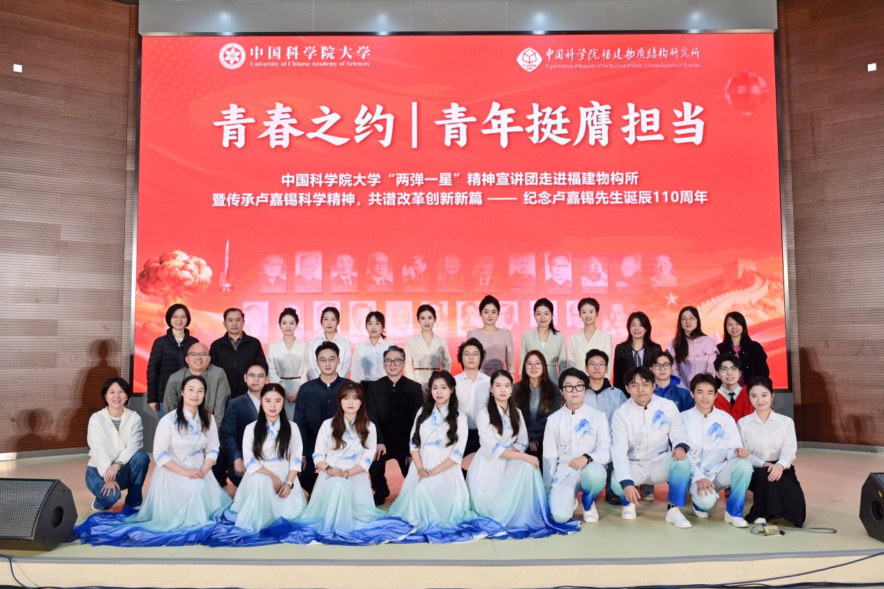 11月21日,中国科学院大学(以下简称“国科大”)“两弹一星”宣讲团走进中国科学院福建物质结构研究所(以下简称“福建物构所”),开展了一场别开生面的“青春之约”专题宣讲。本次活动由国科大团委、福建物构所教育处、研究生会共同主办,所党委书记、副所长张健,国科大团委书记陈睿,教育处人员及300余名师生代表出席活动,共同见证这场青春之约,以青春对话信仰,共同打造“科教融合”思政大课堂。