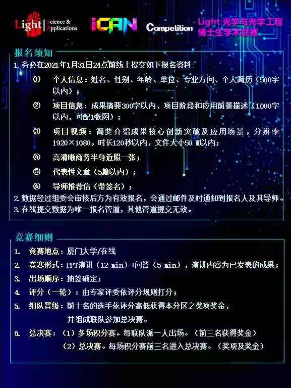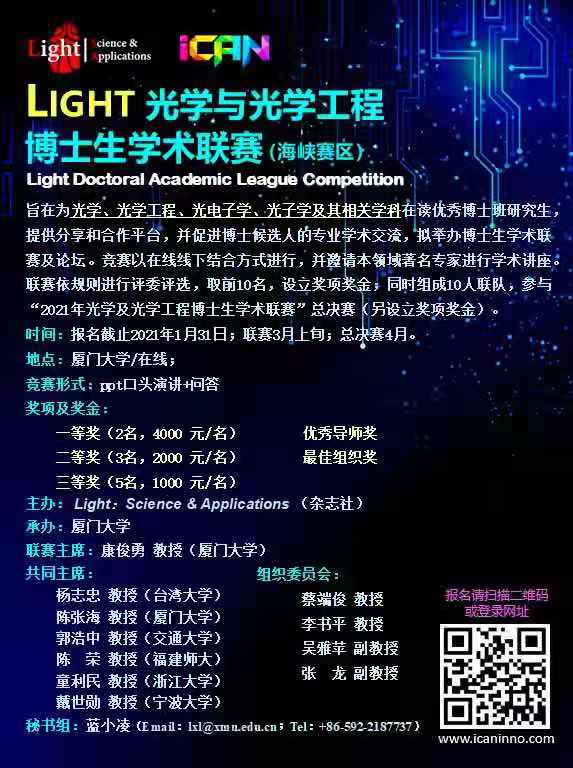 由《Light:Science & Applications》杂志社主办、厦门大学承办海峡分赛区的光学与光学工程博士生学术联赛活动即将开始,请符合条件的博士生积极申报。申报具体要求、报名须知、竞赛细则等如下。