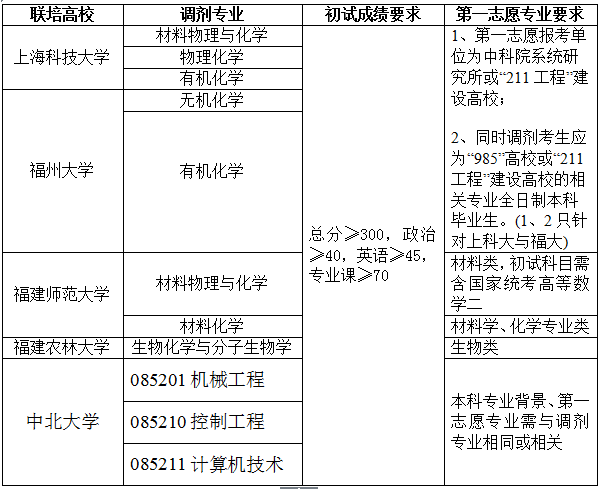 中科院海西研究院(福建物构所)与高校联合培养研究生拟接收以下专业调剂生,具体要求如下: