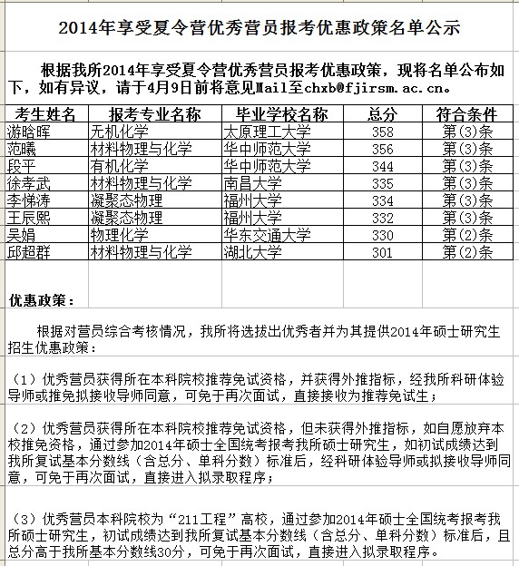 2014年享受夏令营优秀营员报考优惠政策名单公示