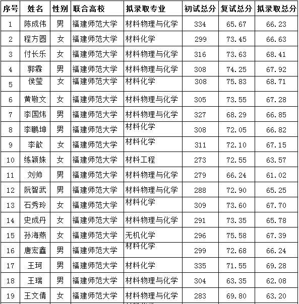 根据我所与高校联合培养研究生协议及复试规程的相关规定,经中科院福建物质结构研究所研究生招生工作领导小组审议,2017年与高校联合培养硕士生拟录取名单如下: