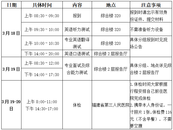(1)时间:3月18日上班时间(上午8:00-11:00,下午14:30-17:00)-19日(上午8:00-11:00),大家根据行程安排自己前往医院完成体检。