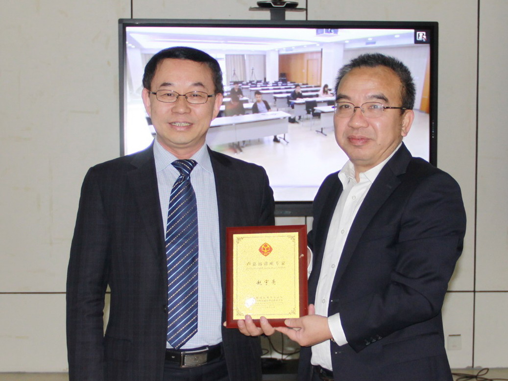 曹荣(右)为赵宇亮院士(左)颁发“卢嘉锡讲座专家”荣誉纪念牌