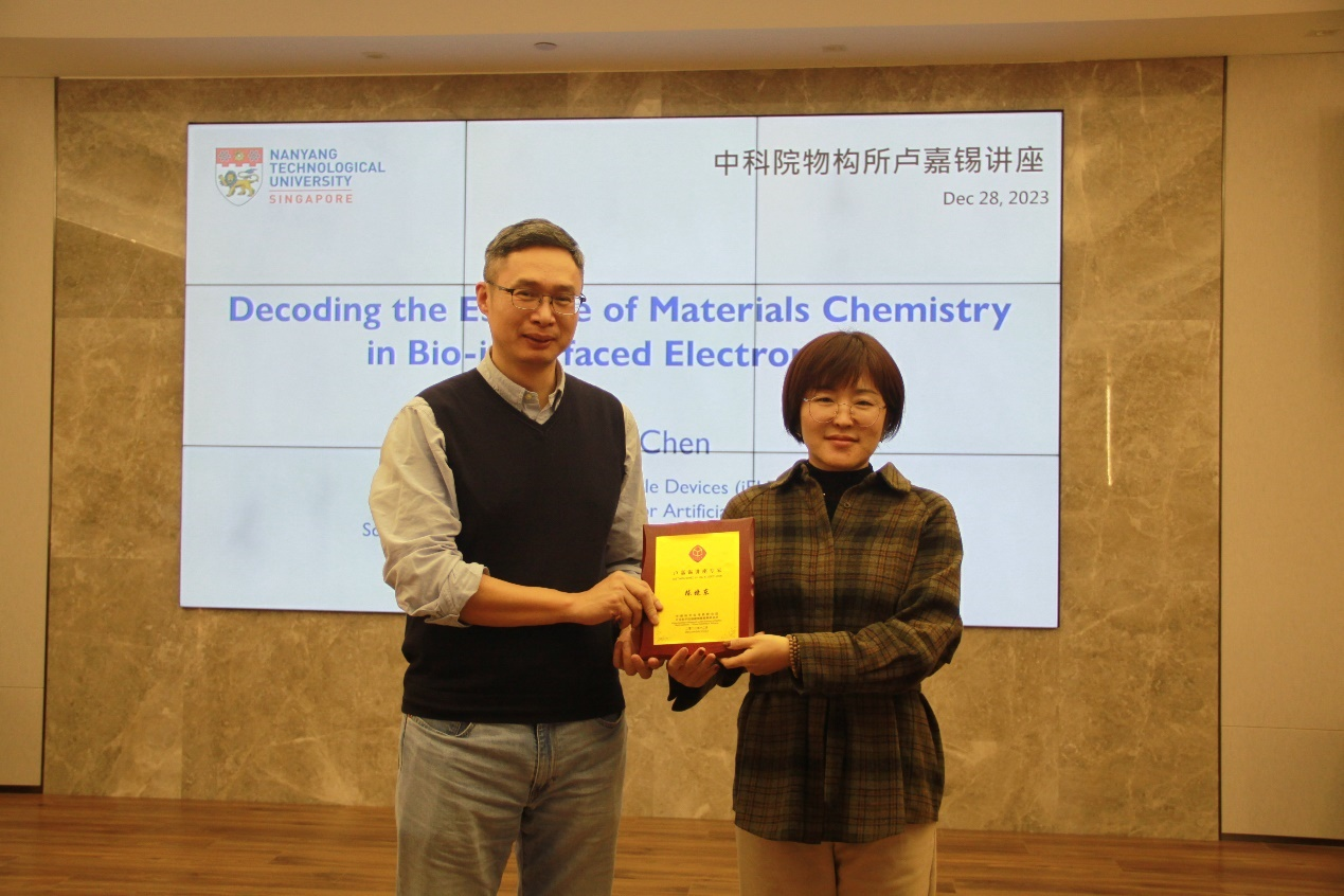 新加坡南洋理工大学陈晓东院士于2023年12月28日访问福建物构所,并作了题为“Decoding the Essence of Materials Chemistry in Bio-interfaced Electronics”的学术报告。鲍红丽副主任主持报告会,并为陈晓东院士颁发了海西研究院“卢嘉锡讲座专家”荣誉纪念牌。在报告会上,陈晓东院士重点介绍了他们团队在柔性电子生物传感器件的最新研究进展,通过多个实际应用案例,介绍了生物传感器在医疗保健、可穿戴设备和智能人机互动等领域的应用。这种新兴的材料设计思路为在场师生提供了一个了解柔性电子前沿科技的宝贵机会,加深了对柔性材料设计和创新的理解,拓宽了学术视野。在提问交流环节,与会的各位老师与同学踊跃发言,积极提问,与陈院士进行互动交流。陈院士则一一耐心解答,分享了他的研究经验和见解,现场学术气氛热烈融洽。