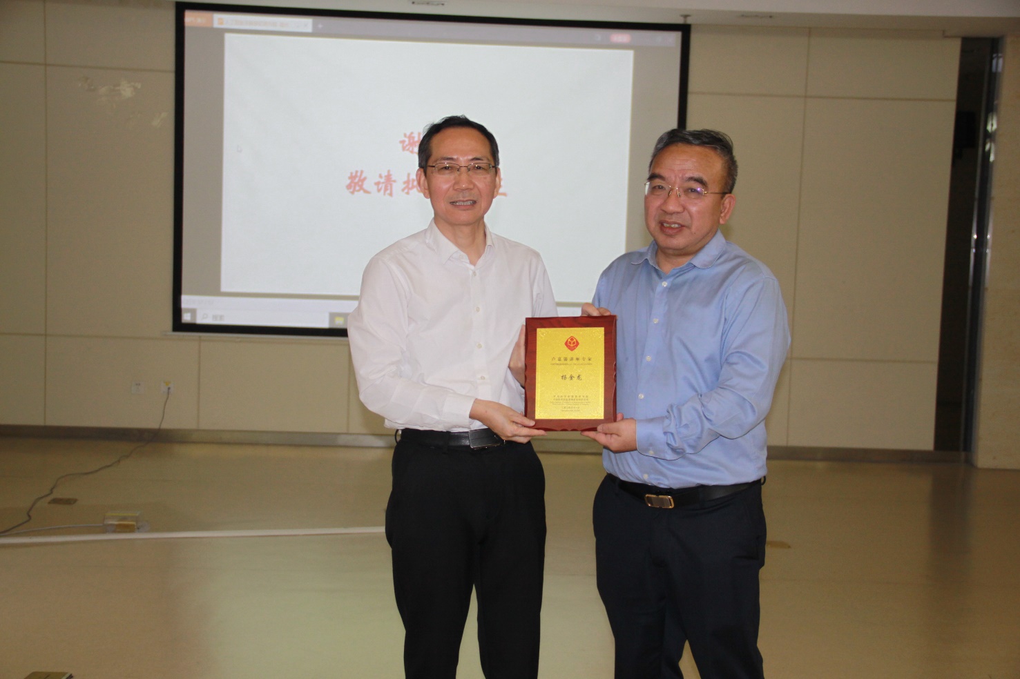 曹荣(右)为杨金龙院士(左)颁发“卢嘉锡讲座专家”荣誉纪念牌