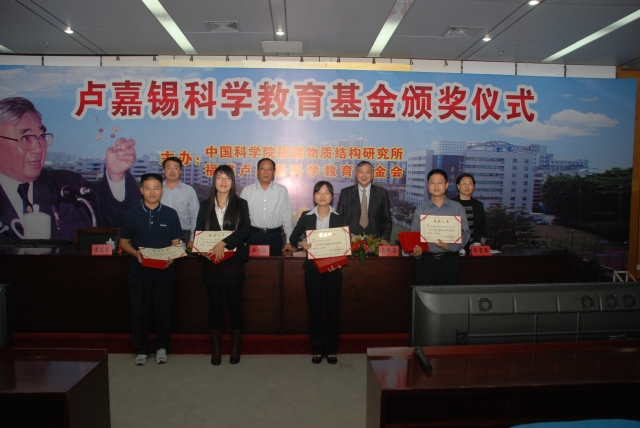 福建卢嘉锡科学教育基金会10月26日,一年一度的福建卢嘉锡科学教育基金颁奖仪式在福建物构所举行。基金会理事长洪茂椿院士,理事吴新涛院士,福建省人大常委、福建社会主义学院副院长陈宜安教授和福建物构所副所长黄艺东共同为2011年度卢嘉锡化学奖、卢嘉锡优秀导师奖、卢嘉锡优秀研究生奖的获得者颁奖。来自全国多所高校、研究所的获奖者以及福建物构所的研究生们齐聚卢老先生长期工作和生活的地方,共同缅怀他的科学精神,弘扬他的学术思想。