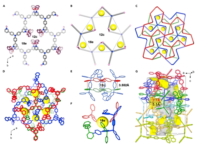 如图2所示,BNF-1的单层结构具有扭曲的(3, 6)拓扑结构。层中具有以Wyckoff位点12c和18e为中心的两个笼空间相互穿插,从而形成互锁结构。在互锁后,这个位点中依然保留半径为4.5埃的可利用功能位点和螺旋孔道。