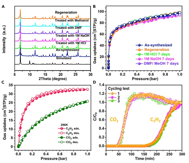BNF-1结构中的二维层彼此互锁稳定了框架,在除去客体分子后依然保持晶性,BET表面积为255 m2/g。不仅如此,互锁的结构也赋予了BNF-1高稳定性,在酸碱和常见有机溶剂中浸泡一周后,材料的孔隙率依然没有明显变化。这种稳定性显著高于现有报道的氮硼配位化合物。此外,BNF-1可以通过简单的放大实验进行克级制备,并易于通过重结晶进行溶解再生。静态气体吸附实验表明在常温下BNF-1a对乙炔具有比对二氧化碳更高的吸附量。动态气体穿透实验表明,BNF-1a能在环境温度下有效分离乙炔和二氧化碳混合物。