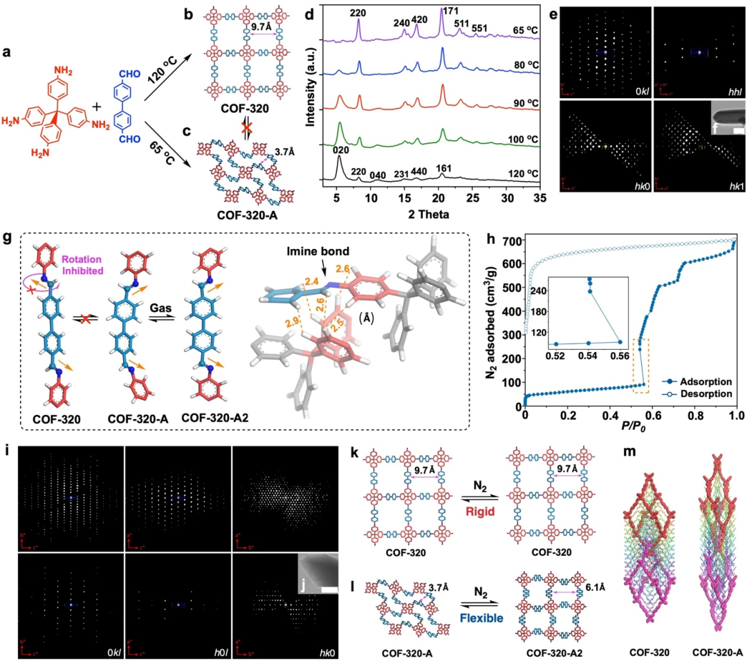 ,这也是目前COF材料所能达到的最小孔径。该团队与瑞典斯德哥尔摩大学黄哲昊(Zhehao Huang)教授团队合作,通过三维电子衍射解析单晶结构,发现这两种晶体具有相同的化学与穿插结构,但相邻两个三维重复单元间的连接结构存在空间构象上的不同。且由于晶胞在空间上的限制,这种构象差异不能通过单键旋转而相互转变,从而导致所生产的两种晶体不能相互转化。作者将这类具有相同化学与穿插结构,但晶体结构不同且不能相互转化的晶体命名为COF晶体的阻旋异构体。作者表示,这也是在具有无限延展的共价晶体结构中首次发现阻旋异构现象。重要的是,这两种阻旋异构体具有截然不同的气体吸附行为,其中一种异构体(孔径9.7