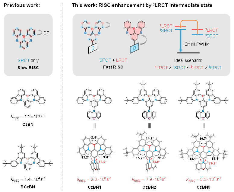 开发具有窄谱带发射的有机电致发光材料和器件是满足未来高清化显示要求,并保持有机发光二极管(OLED)技术竞争力的关键。多重共振型热活化延迟荧光(MR-TADF)材料由于其刚性骨架及独特的短程电荷转移(SRCT)特性表现出窄谱带发射和高效率的优势,目前已成为有机电致发光领域的研究热点。然而,该类材料通常反向系间窜越速率(kRISC)较为缓慢,相应OLED器件在高亮度下效率滚降较为严重,不利于器件的实际应用。