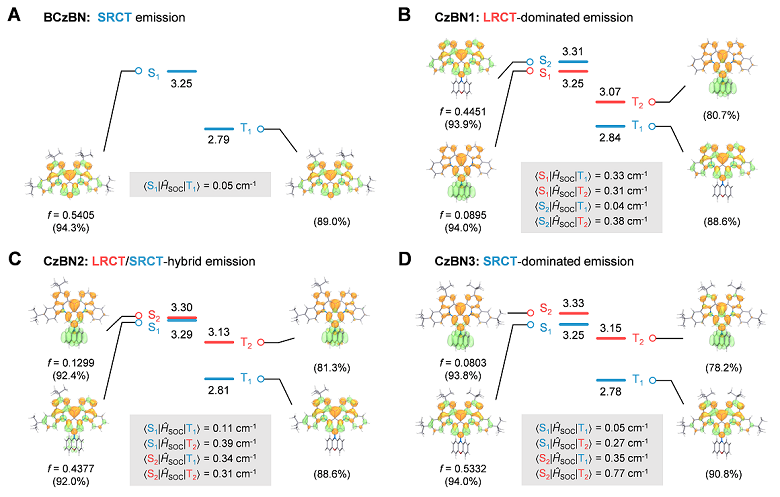 图2. BCzBN及CzBN1-3能级分布、自然跃迁轨道及自旋轨道耦合常数