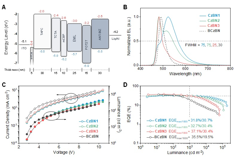 基于CzBN1-3发光层客体材料制备的蒸镀型电致发光器件表现出相似于材料本征的发射光谱,其中CzBN1和CzBN2为宽谱带发射(FWHM > 75 nm),而CzBN3保持了窄谱带发射特性,半峰宽仅为21 nm。得益于理想的荧光量子产率(99%)和kRISC,基于CzBN3的器件外量子效率高达37.1%,在1000 cd/m2的亮度下仍然保持30.4%的高效率。相比之下,基于BCzBN制备的器件则受制于较低的激子利用率,表现出更低的外量子效率以及严重的效率滚降,在1000 cd/m2的亮度下外量子效率仅为19.5%。该工作进一步制备了基于CzBN3的超荧光OLED器件,并获得了高达42.3%的外量子效率(1000 cd/m2时34.1%)。