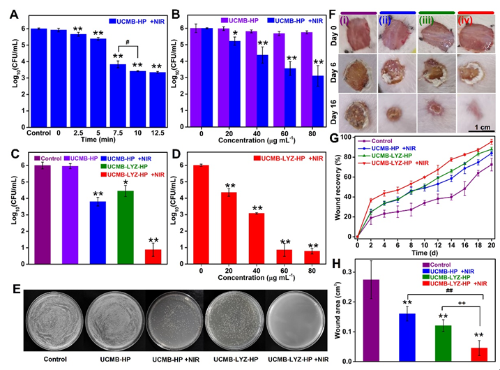 图3:(A-E)体外抗耐药菌MRSA实验:(A)UCMB-HP在不同近红外光照射时间的杀菌效果(激光功率0.5 Wcm-2);(B)UCMB-HP在不同给药浓度的杀菌效果;(C)不同药物处理的杀菌效果;(D)UCMB-LYZ-HP在不同给药浓度的杀菌效果;(E)不同药物处理的MRSA在LB琼脂平板上的菌落照片。(F-H)不同药物治疗深层组织MRSA感染的效果比较:(F)小鼠在治疗第0天、6天和16天的伤口图;(G)小鼠伤口的愈合曲线;(H)小鼠在治疗第20天的伤口面积。在不同药物处理中,UCMB-HP为无光照及无溶菌酶条件,UCMB-HP + NIR为光动力杀菌,UCMB-LYZ-HP为溶菌酶杀菌,UCMB-LYZ-HP + NIR为溶菌酶-光动力协同杀菌。