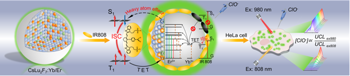 针对这一难题,中科院功能纳米结构设计与组装/福建省纳米材料重点实验室陈学元团队近期提出了一个新颖的策略,即利用CsLu2F7:Yb/Er纳米晶基质中的重原子效应,实现了IR808染料三重态敏化稀土离子的高效上转换发光;进而基于IR808修饰CsLu2F7:Yb/Er纳米探针的808-nm/980-nm双激发比率型荧光信号,实现了对HeLa癌细胞中次氯酸根的灵敏检测(图1)。