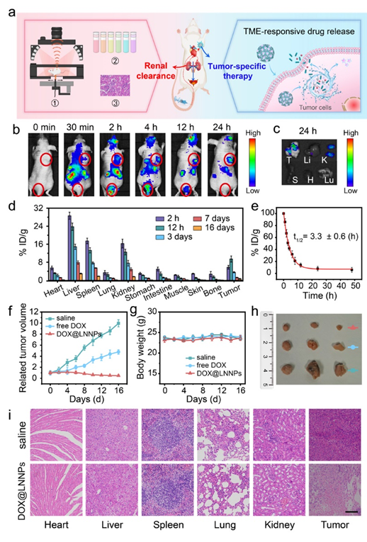 图3、(a)兼具肾脏清除能力和肿瘤微环境响应可生物降解特性的DOX@LNNPs用于精准的肿瘤治疗示意图;(b)尾静脉注射DOX@LNNPs后不同时间下MCF-7乳腺癌荷瘤小鼠的荧光图像。图中位于上方和下方的红圈分别代表了肿瘤和膀胱区域;(c)注射24h后收集的离体器官和肿瘤的荧光图像(T:肿瘤,Li:肝,K:肾,S:脾,H:心,Lu:肺);(d)DOX@LNNPs在荷瘤小鼠体内的生物分布;(e)DOX@LNNPs在荷瘤小鼠体内的血液循环时间;(f)分别经生理盐水、游离 DOX 和DOX@LNNPs处理的小鼠肿瘤生长曲线;(g)不同处理组的小鼠体重变化;(h)从小鼠体内分离出的肿瘤的照片;(i)在第16天采集的小鼠主要器官和肿瘤的组织学图像。图中标尺均为100μm。