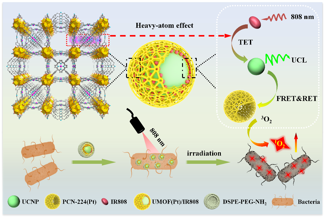 图1. 基于卟啉MOF-稀土上转换纳米平台实现高效光动力抗菌治疗的示意图