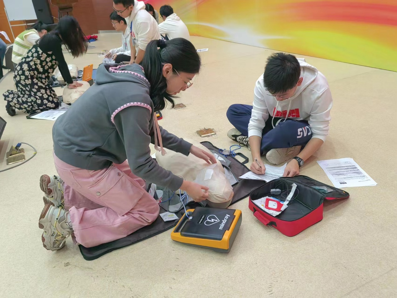 本次活动主要讲解了急救流程、气道异物梗阻(窒息)的识别和处理方法、创伤急症的包扎处理工作、成人心肺复苏(CPR)和自动体外除颤仪(AED)的操作。急救导师生动细致地讲解,并把理论与实践有机结合,师生们积极参与实践操作,熟悉心肺复苏的整个流程,并反复练习心脏按压、开放气道等每个动作,使每个动作都正确且标准。