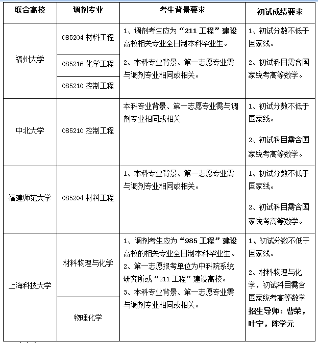 一.中科院海西研究院(福建物构所)与高校联合招收研究生拟接收以下专业调剂生,具体要求如下:
