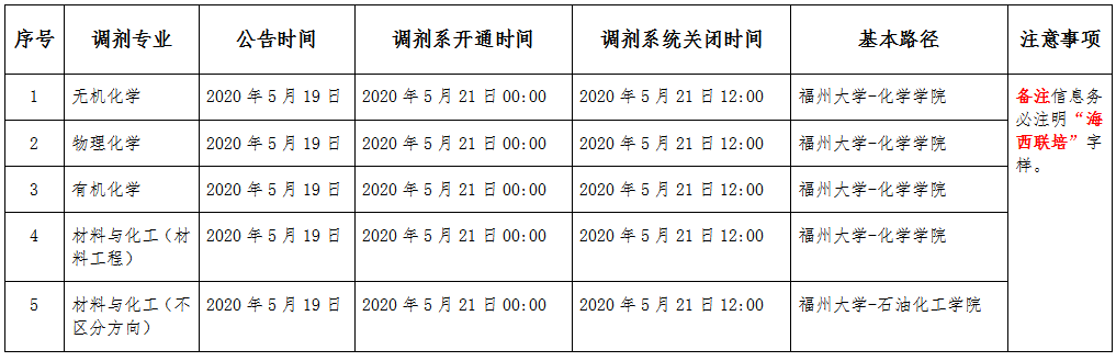 各位考生:我所与福州大学联培硕士研招网调剂系统(网址:https://yz.chsi.com.cn/)拟于2020年5月21日00:00开放,发布各专业缺额信息,请各位考生及时登录申请。特此公开如下: