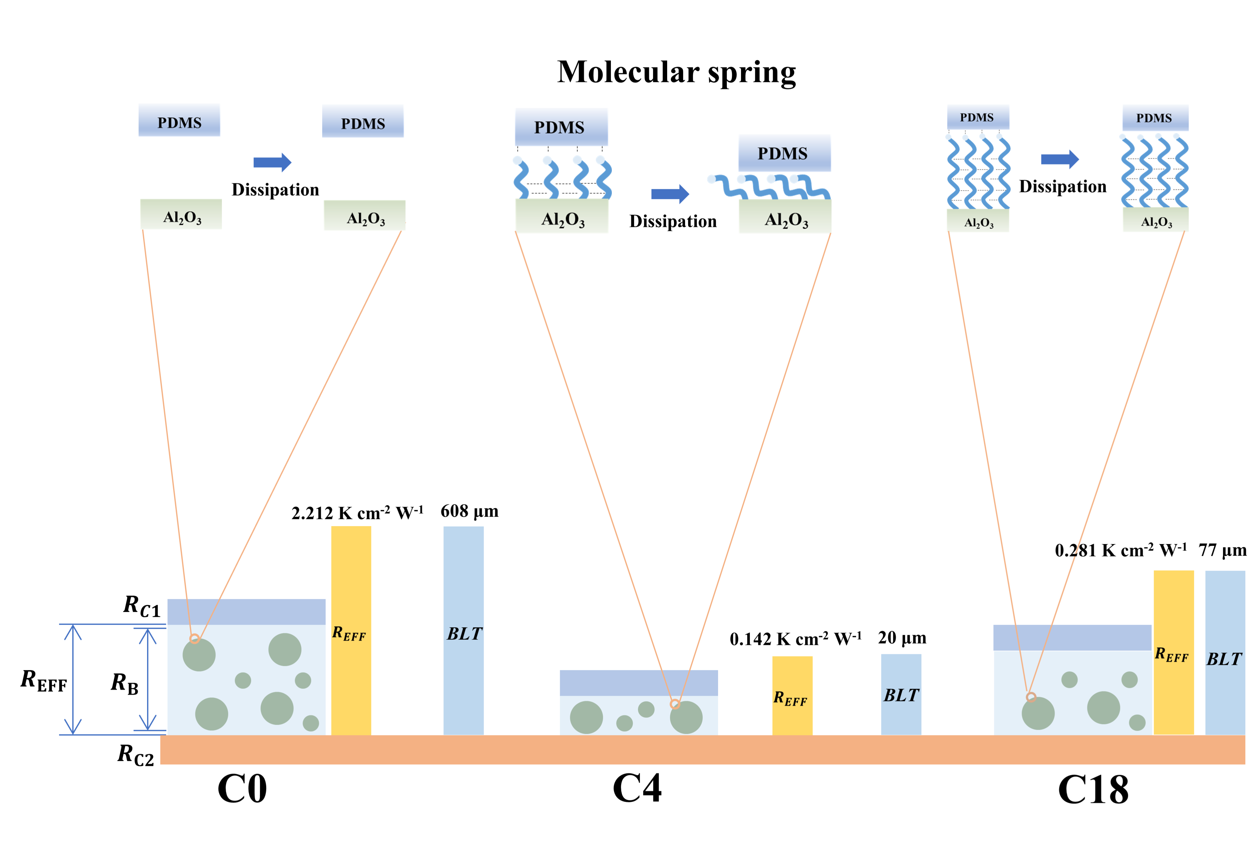 该研究针对电子器件散热中界面热阻高的问题,通过调控填料表面分子链长,发现当链长为C4时,填料与基体表面能最匹配,材料在封装中更易压薄、贴合更紧密。实验表明,C4体系可将有效热阻降至0.142 K·cm2·W-1,比未修饰材料降低超过90%。
