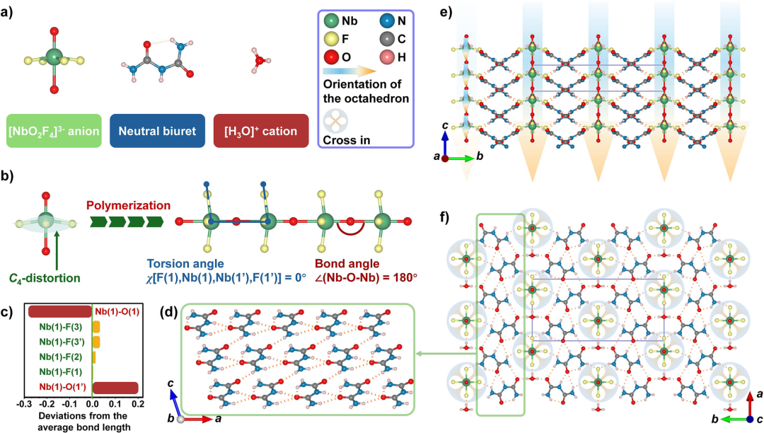 氟化氧化物具有平衡的光学性质,是一类很有前途的非线性光学(NLO)材料。它们含有的氟化功能过渡金属异阴离子[TMOxFy]单元具有较强的极化率各向异性和较大的最高占据分子轨道-最低未占据分子轨道(HOMO-LUMO)能隙,弥补了略微降低的超极化率。因此,由这些氟氧官能团构建的块状晶体材料具有更短的吸收边和增强的双折射率,这对相位匹配至关重要。d0过渡金属(TM)氧氟化物继承了完全氧化的同类材料优点,而它们更宽的带隙为探索紫外(UV)NLO晶体提供了丰富的来源。然而,有效地安排光学发色团以实现强烈的光学非线性仍然是具有挑战性的。最近,韩国西江大学Kang Min Ok、Joon Ik Jang研究团队和河北大学张兵兵教授研究团队合作,通过将1[NbOF4]∞链与各种有机结构引导剂相结合,成功地发展了一系列含氧氟硝酸酯类化合物。相关研究成果以“Exceptional second harmonic generation in ultraviolet nonlinear optical oxyfluoroniobate crystals via structural fingerprint optimization of polar chains”为题发表在《德国应用化学》期刊上(Angew. Chem. Int. Ed., 2025, DOI: 10.1002/anie.202512618)。