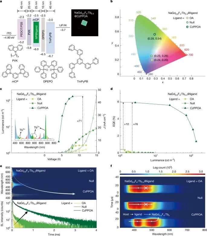 图3. NaGd0.6F4:Tb0.4@ligand 设备的 EL 性能,图来源:Nature