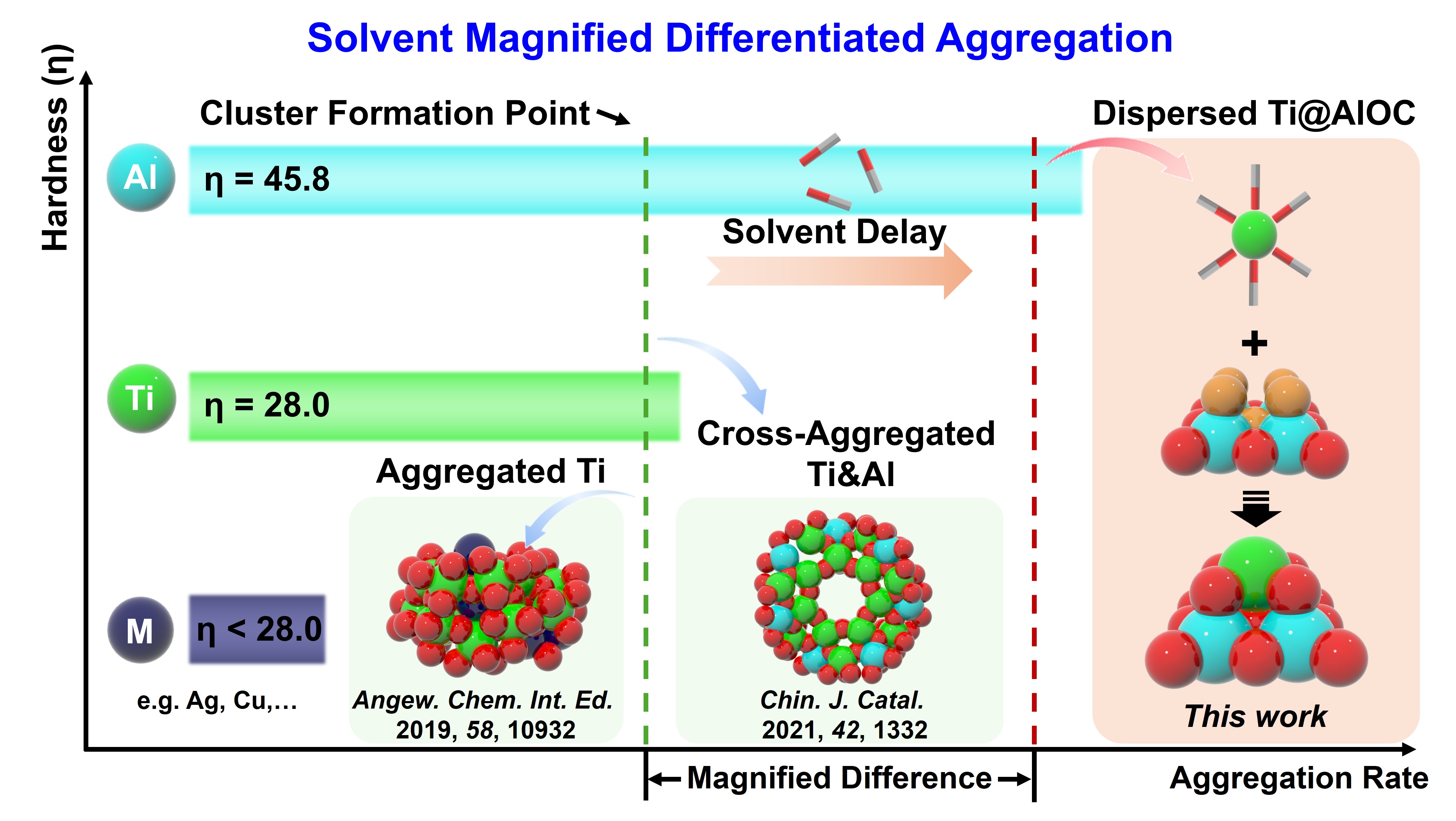 为解决这一问题,中国科学院福建物质结构研究所方伟慧团队和张健团队创新地提出“溶剂放大差异性聚集”策略。通过醇类溶剂的配位延迟作用,充分放大Al3+与Ti4+的聚集动力学差异。在保持Ti4+游离的同时,诱导Al3+优先聚集为铝氧簇(AlOCs)载体,并以末端暴露的钛活性位点形式锚定溶液中游离的钛组分。基于该策略,研究团队成功构筑了结构明确的Ti4Al6簇,其具有类似天然θ-Al2O3的载体结构。进一步研究表明,该类载体平台易于通过后合成修饰进行功能化(如引入二茂铁基团),并可进一步调控以实现钛的单原子分散。最优催化剂Ti2Al4-Fc(具有γ-Al2O3类似结构)在可见光驱动CO2还原反应中,实现了高达2.4 h-1的钛原子周转频率,其性能显著优于许多已报道的钛基光催化剂。本工作为设计原子级分散、高原子利用率的多金属氧簇光催化剂提供了新的范式。